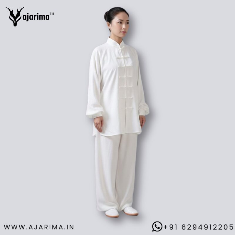 Traditional Chinese Taichi uniform in elegant white color, designed as a complete upper and lower combination set. Perfect for women practicing Taichi, Wushu, and Kung Fu at beginner, intermediate, or professional level.