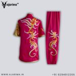 A Wushu uniform with Phoenix embroidery features a traditional, lightweight design made from silk or satin, allowing for flexibility and comfort. The uniform typically includes a jacket with wide sleeves and loose-fitting pants. The standout detail is the intricate Phoenix embroidery, often in gold or silver, symbolizing strength, grace, and rebirth. The Phoenix is usually displayed on the back or chest, adding a vibrant and dynamic touch to the uniform.