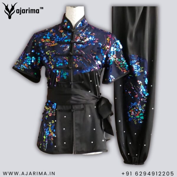 Made with lightweight, breathable fabric, the GraceFlow suit offers maximum flexibility and comfort, allowing for swift kicks, deep stances, and fluid transitions. Its aerodynamic cut and moisture-wicking design help maintain peak performance during intense training and competition. Reinforced stitching and stretch panels provide durability and ease of motion, while the suit’s elegant finish and tailored fit elevate your stage presence.