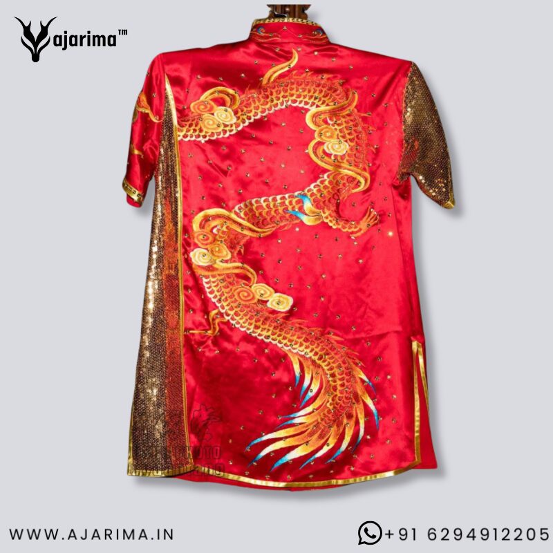 This Kids Wushu Taolu Dress is specially designed for young Taolu performers who take part in training, competitions, and stage performances. The vibrant red colour with powerful dragon artwork and golden detailing gives a bold, confident, and traditional martial arts look.