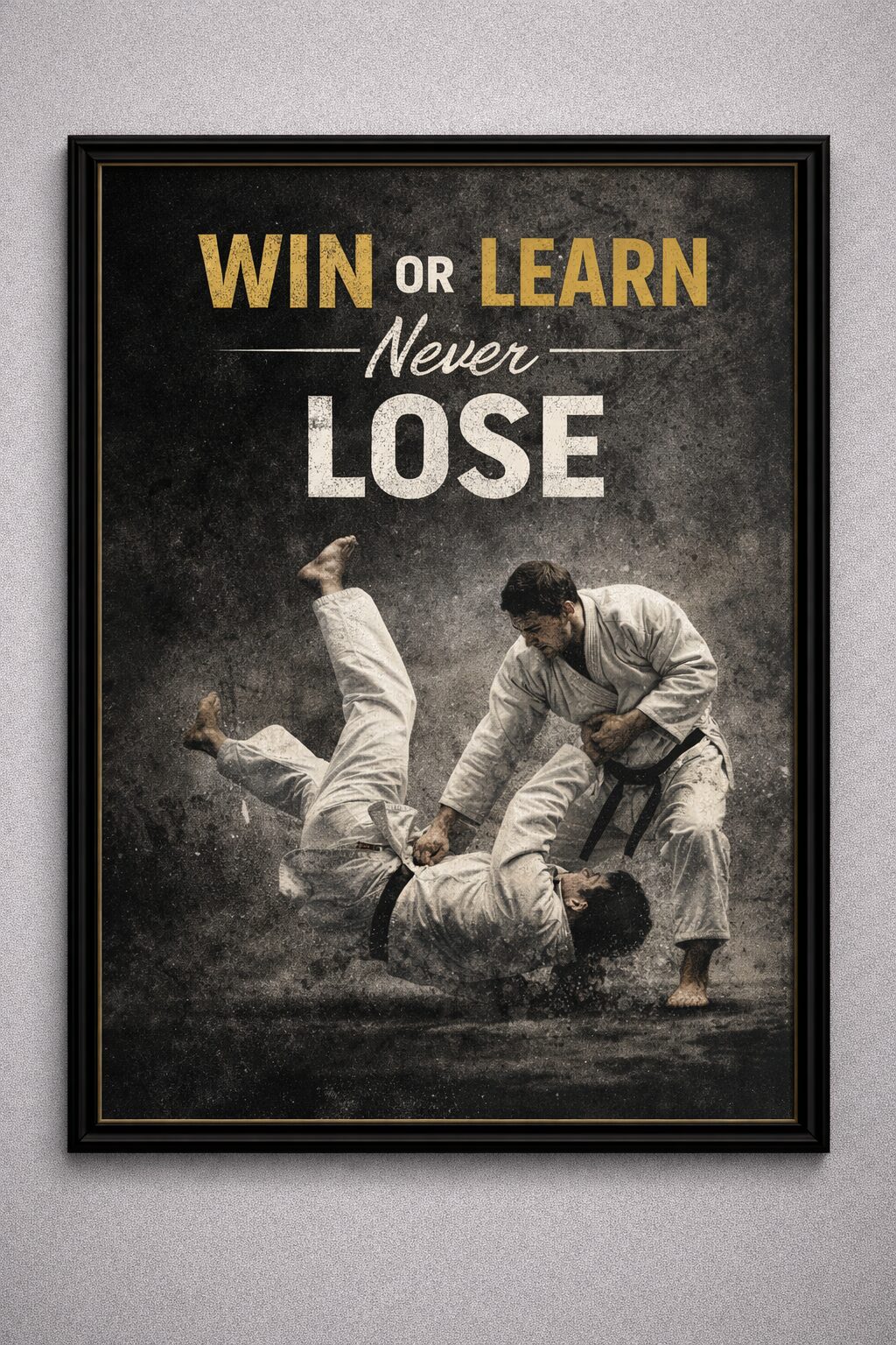 Powerful martial arts wall frame with the quote “Win or Learn, Never Lose” — perfect for gym, dojo, and mindset-driven spaces.