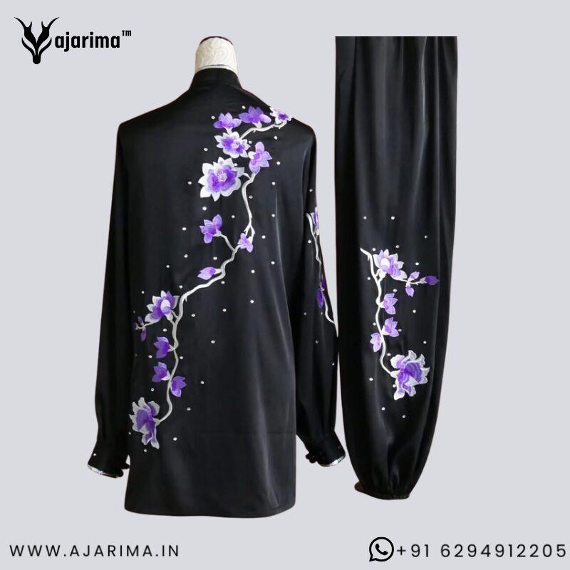 Perform with confidence and elegance in this Tai Chi Competition Dress, specially designed for men and women in India. This professional Wushu Taolu uniform features a classic black base with refined floral embroidery, giving a graceful and powerful appearance during competitions and stage performances.