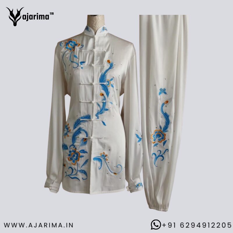 Premium white Taichi competition dress designed for both men and women, ideal for national and international Wushu events. Made from high-quality lightweight fabric that ensures smooth flow, comfort, and flexibility for graceful Taichi movements.