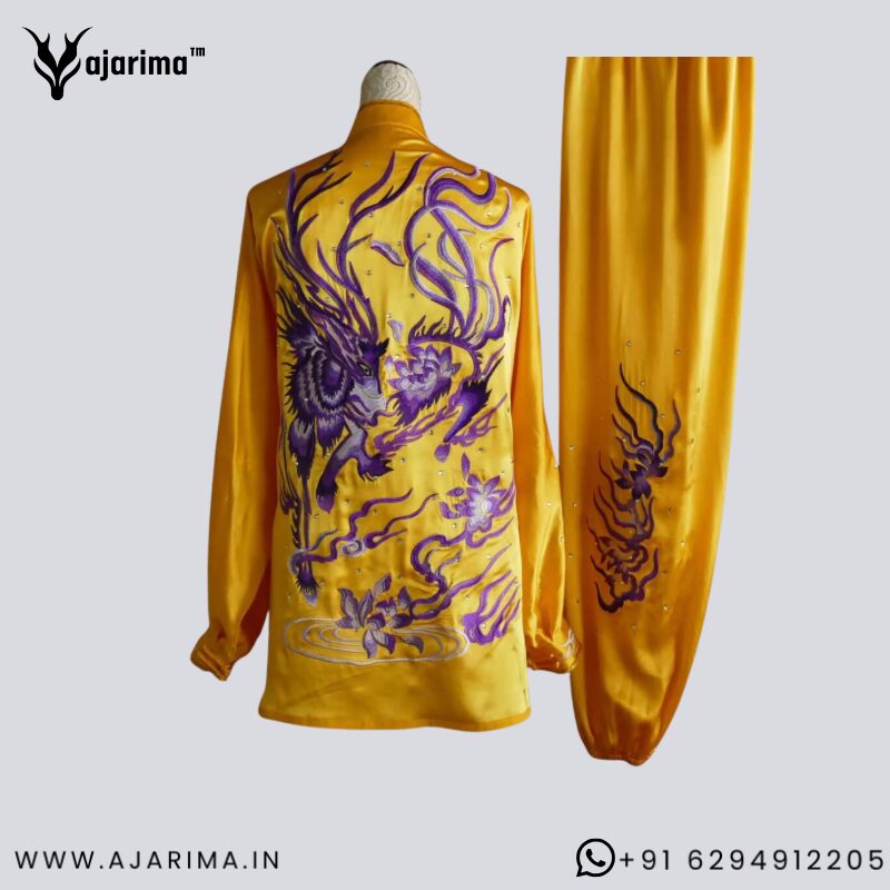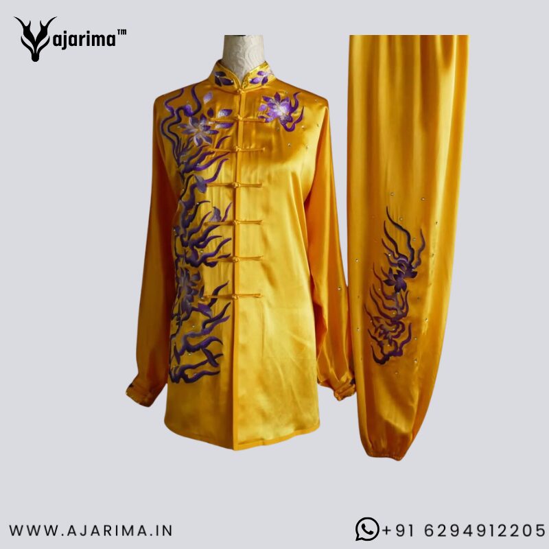 The smooth, breathable material allows free movement during practice, training, and stage performances. The rich yellow color with artistic embroidery enhances visual appeal, making it ideal for competitions, demonstrations, and cultural events.