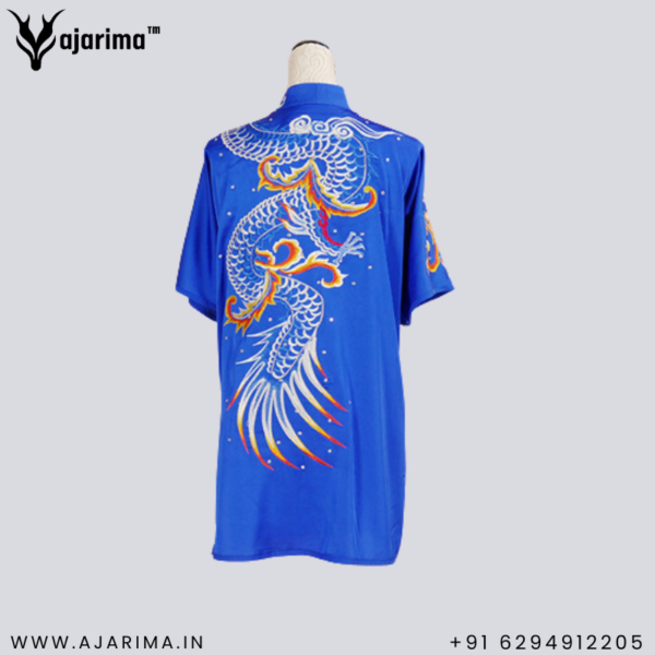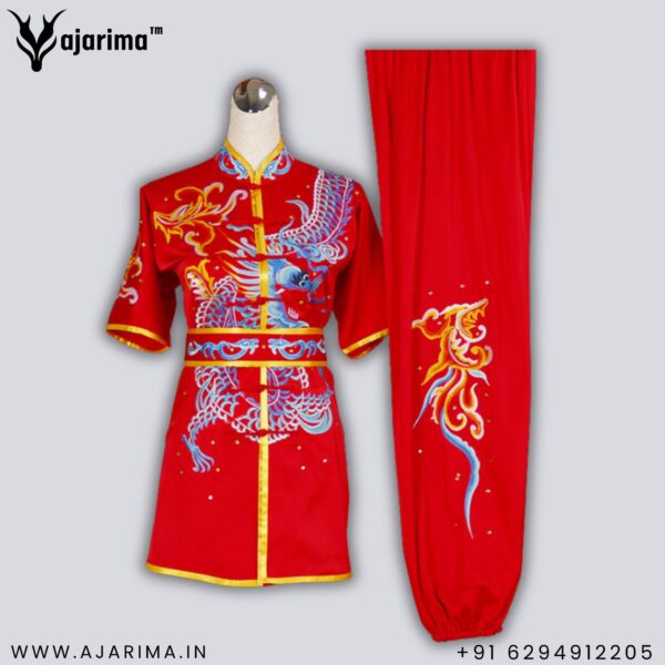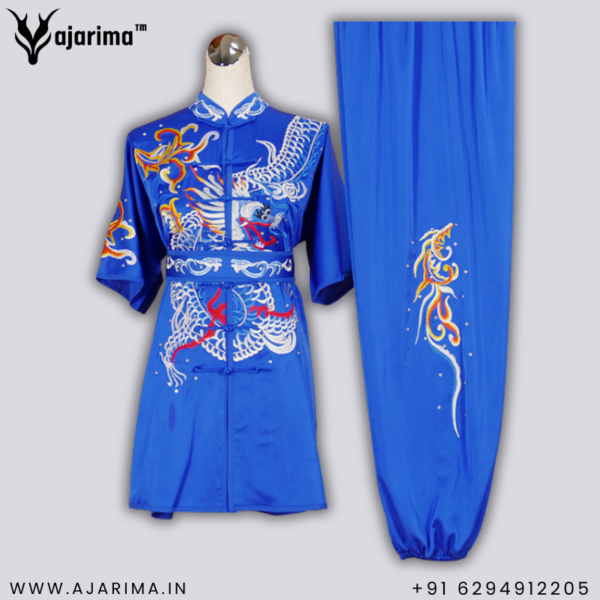 - The fabric used for the uniform is often designed to be durable, light, and breathable. It is typically either satin or polyester, giving it a slightly glossy finish that reflects the fluidity and grace of the Wushu movements.
