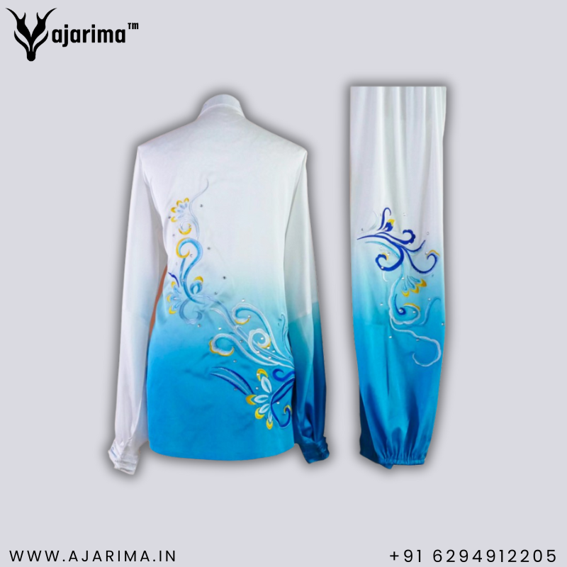 A Wushu Taijiquan double-color competition uniform features a two-tone design, combining two complementary or contrasting colors to enhance the visual appeal and elegance of the outfit.
