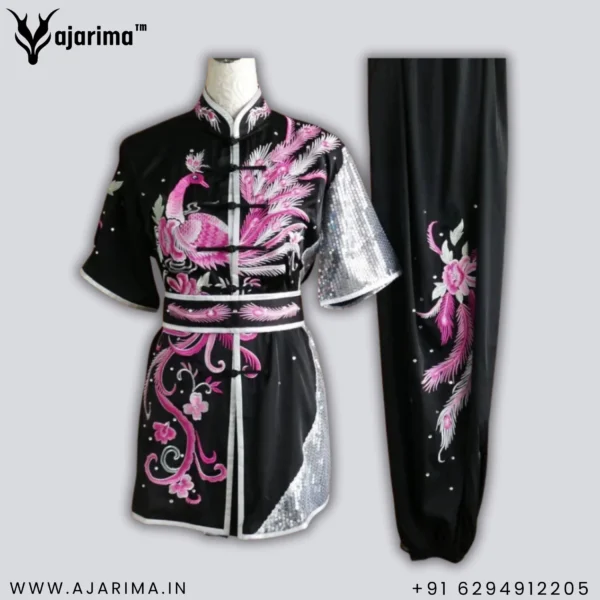 Step into the arena with commanding presence and refined artistry in the Wushu Taolu Gunshu Dress Black Bloom: Embroidered Elegance. This exquisite garment is designed for athletes who seek to embody the dual essence of strength and grace. The deep black base represents discipline, mystery, and focus—core virtues of the Wushu tradition—while vivid embroidery of peacocks and blooming florals brings life and vibrancy to every movement.