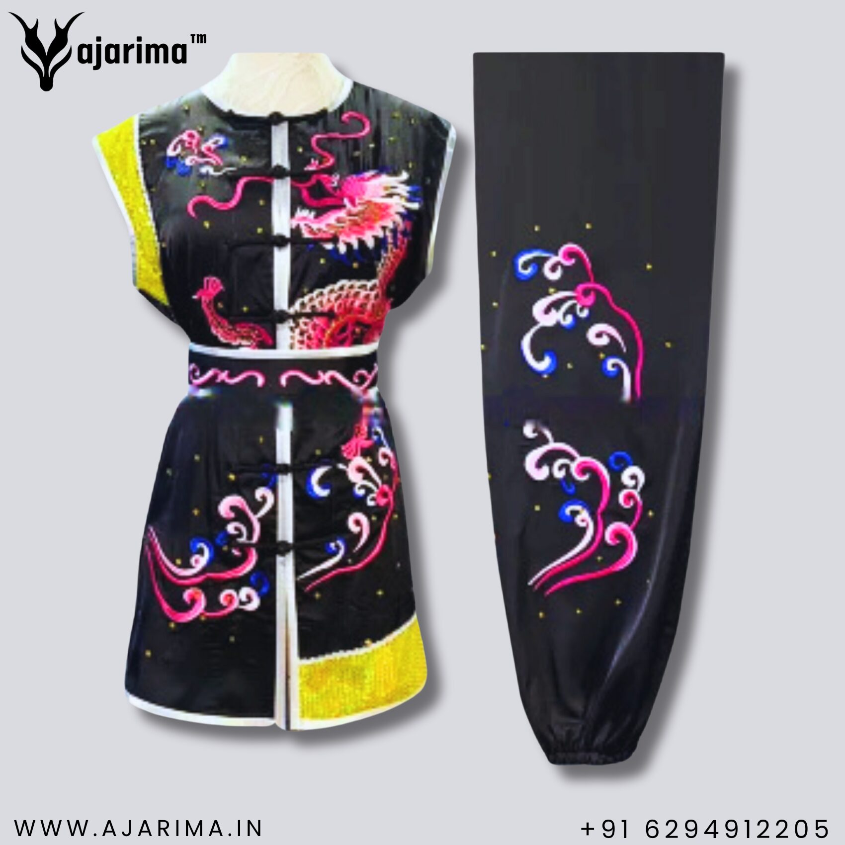 A Wushu Taolu Nanquan competition uniform typically features vibrant colors and intricate designs. Here are the key elements: