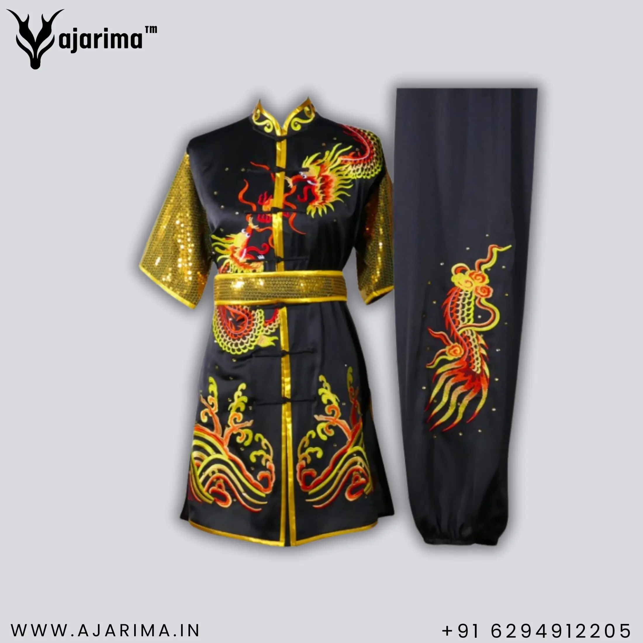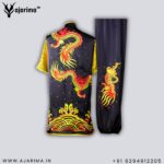 The centerpiece of this garment is its intricate embroidery: a majestic dragon, representing power, agility, and courage, intertwined with elegant water wave patterns, symbolizing grace, adaptability, and the continuous flow of energy. These detailed motifs are often placed along the chest, sleeves, or pant legs, creating an eye-catching effect during motion.